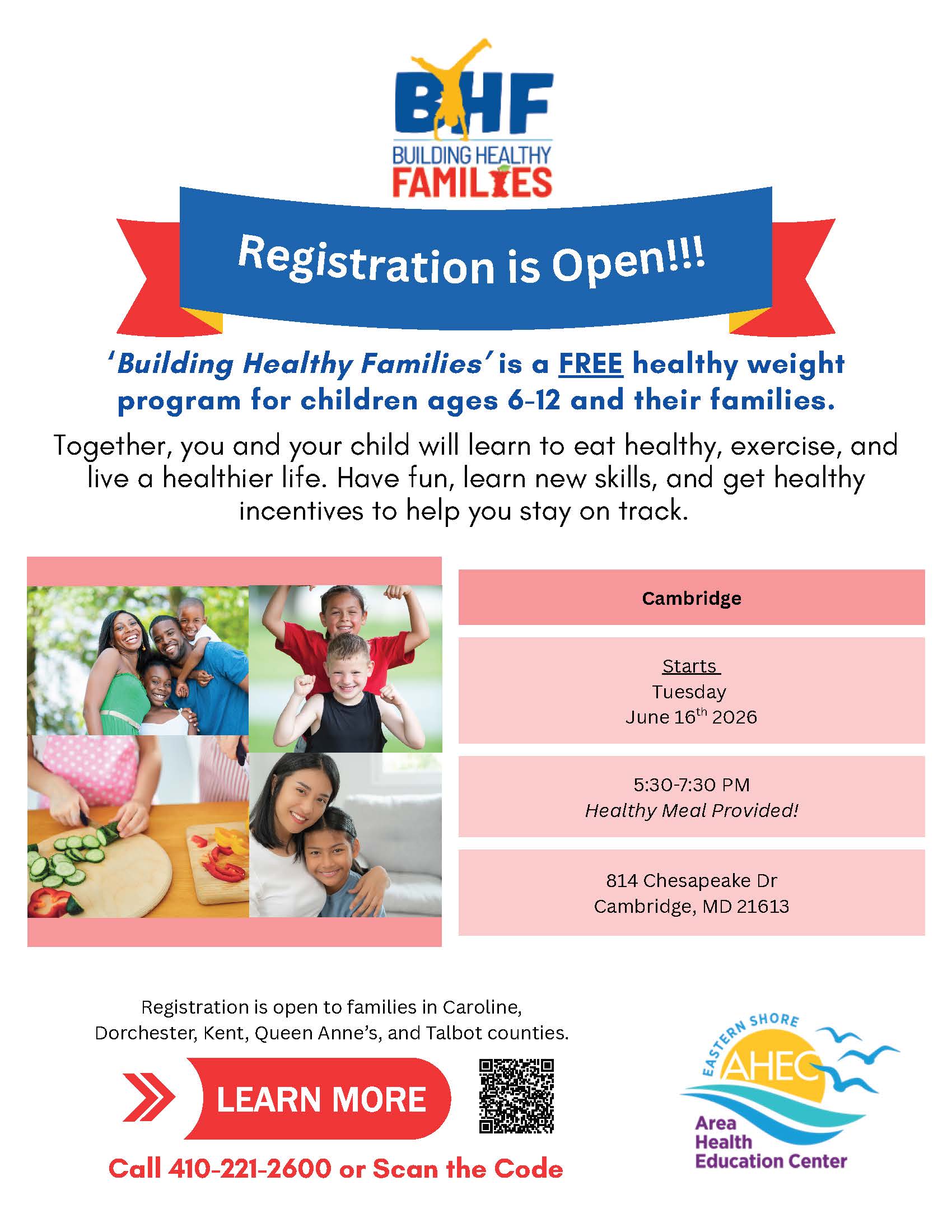 Building Healthy Families (BHF) is effective in helping families, children, and parents make sensible and sustainable changes to their nutrition and physical activity, using research-tested behavior change strategies through a person-first and health-centered approach. BHF is designed for children between the ages of 6 and 12 years old with a BMI above the 95th percentile, and their parents and siblings.
